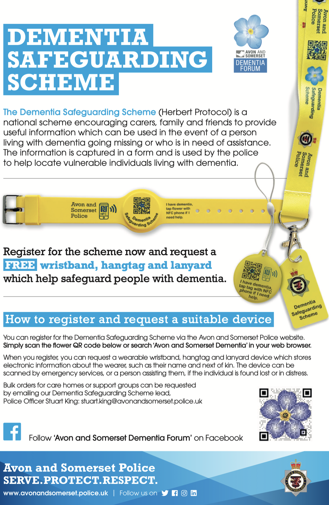 Please see attached information relating to Avon and Somerset Polices Dementia Safeguarding Scheme, including the Herbert Protocol. Please share the information with colleagues, clients and family/friends of the people you support who are living with dementia.