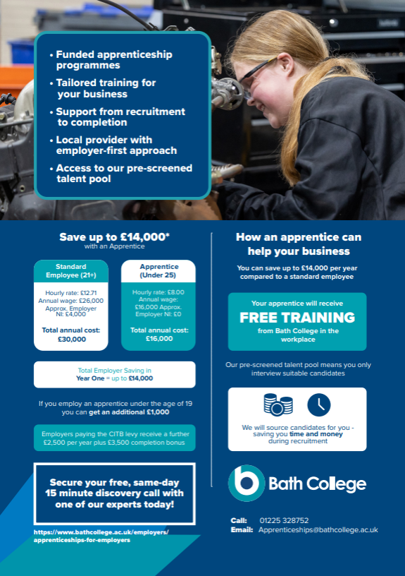 Bath College would love to discuss how our apprenticeships can be tailored to meet your specific needs. Please feel free to contact me if you're interested in taking on a new apprentice or upskilling your current staff.